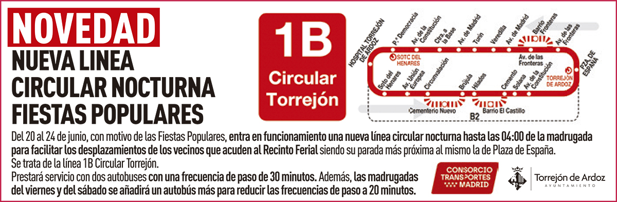 Este año, como novedad, prestará servicio una nueva línea circular nocturna durante la celebración de las Fiestas Populares. Así, hasta hoy 24 de junio, con motivo de las Fiestas Populares, está en funcionamiento una nueva línea circular nocturna hasta las 04:00 horas de la madrugada para facilitar el desplazamiento de los vecinos que acuden al Recinto Ferial siendo su parada más próxima al mismo la de Plaza de España. Se trata de la línea 1B Circular Torrejón. Prestará servicio con dos autobuses con una frecuencia de paso de 30 minutos. Además, las madrugadas del viernes y del sábado se añadirá un autobús más para reducir las frecuencias de paso a 20 minutos.