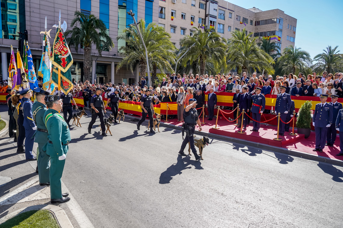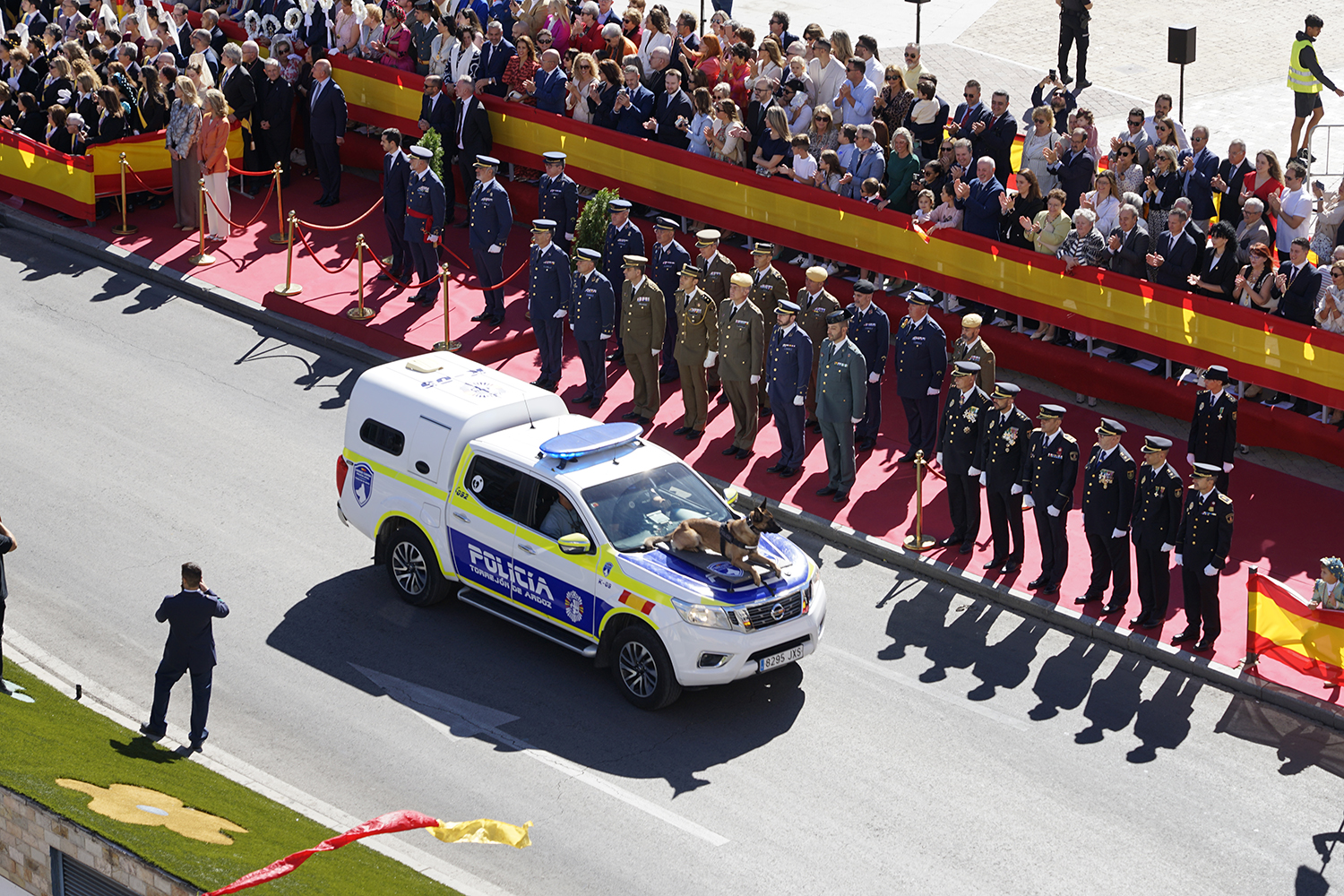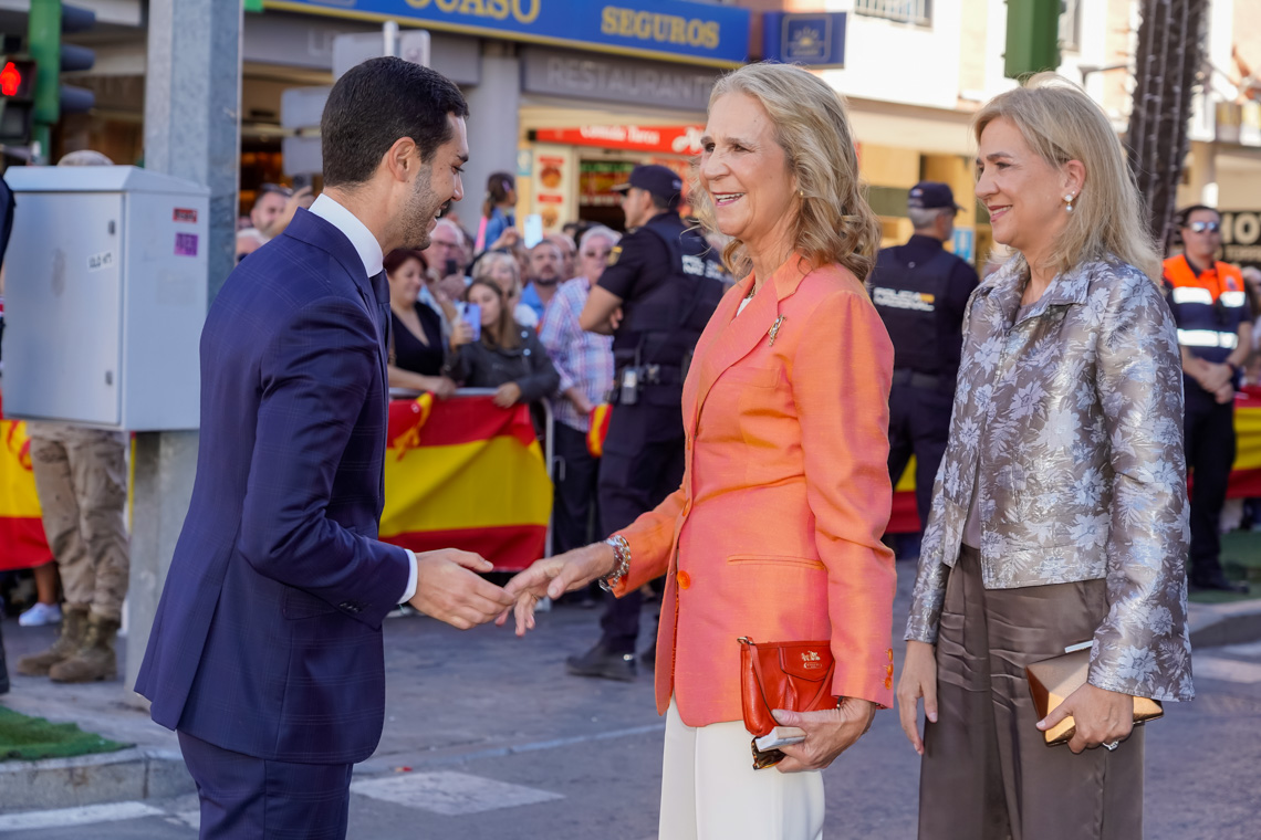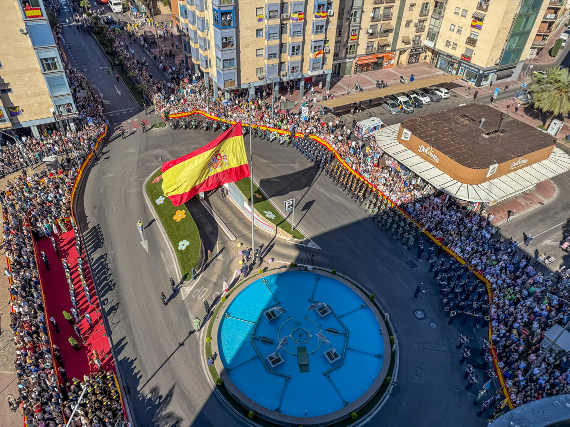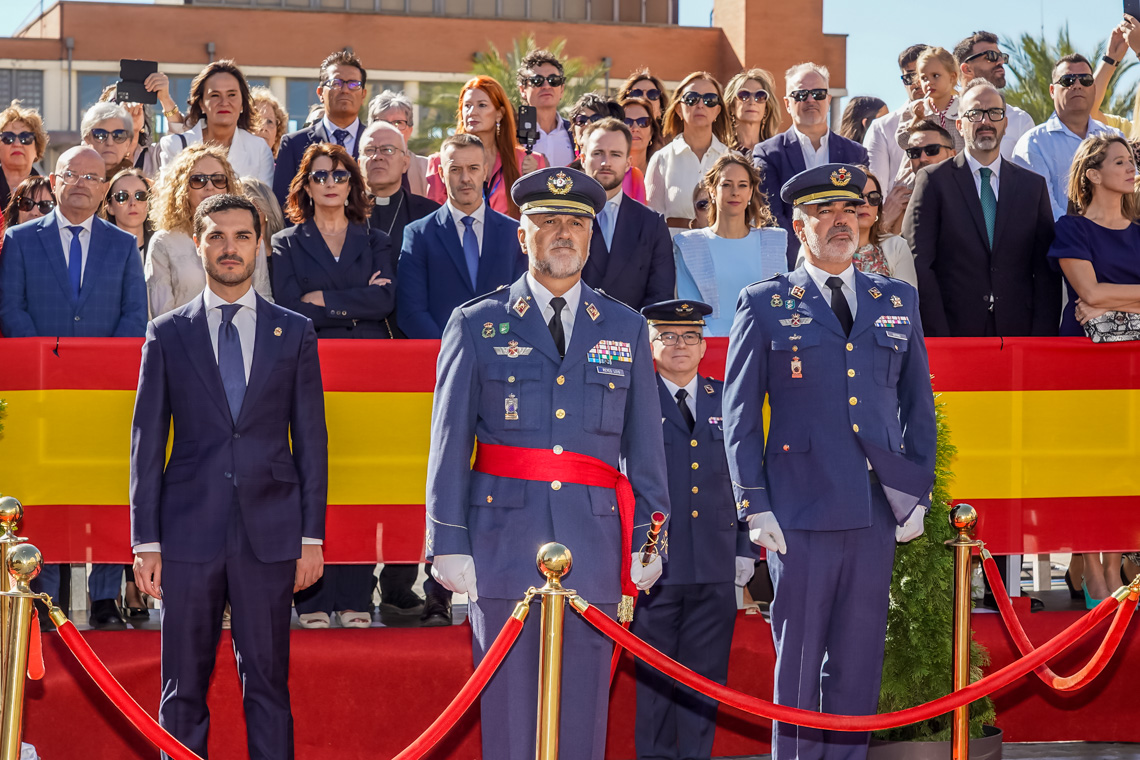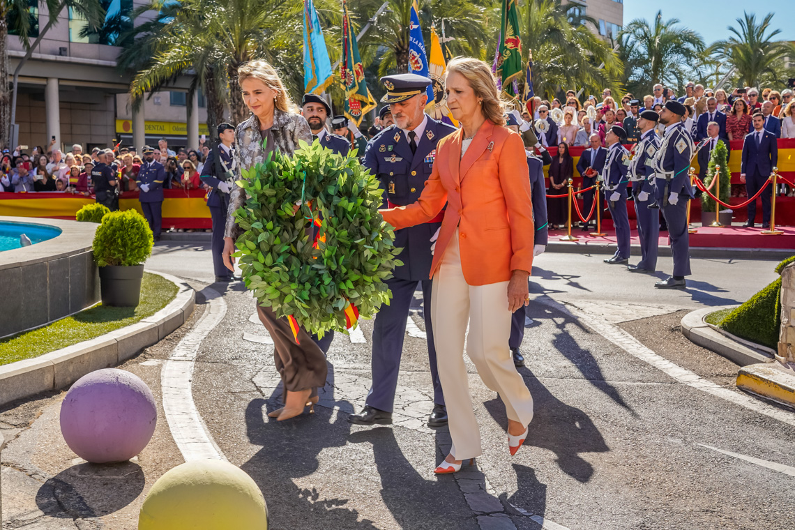 Torrejón de Ardoz, 6 de octubre de 2025. El Homenaje a la Bandera se confirmó como uno de los mejores de la Comunidad de Madrid y contó con la presencia de las infantas Elena y Cristina que hicieron la ofrenda a los caídos en un emotivo acto y desfile militar que debido al fuerte viento no pudo contar con la participación de la Patrulla Acrobática de Paracaidismo del Ejército del Aire, pero sí con una importante representación de nuestras Fuerzas Armadas, así como de las Fuerzas y Cuerpos de Seguridad del Estado.
