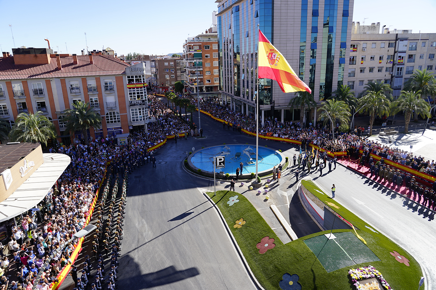 • El Homenaje a la Bandera se confirmó como uno de los mejores de la Comunidad de Madrid y contó con la presencia de las infantas Elena y Cristina que hicieron la ofrenda a los caídos en un emotivo acto y desfile militar que debido al fuerte viento no pudo contar con la participación de la Patrulla Acrobática de Paracaidismo del Ejército del Aire, pero sí con una importante representación de nuestras Fuerzas Armadas, así como de las Fuerzas y Cuerpos de Seguridad del Estado